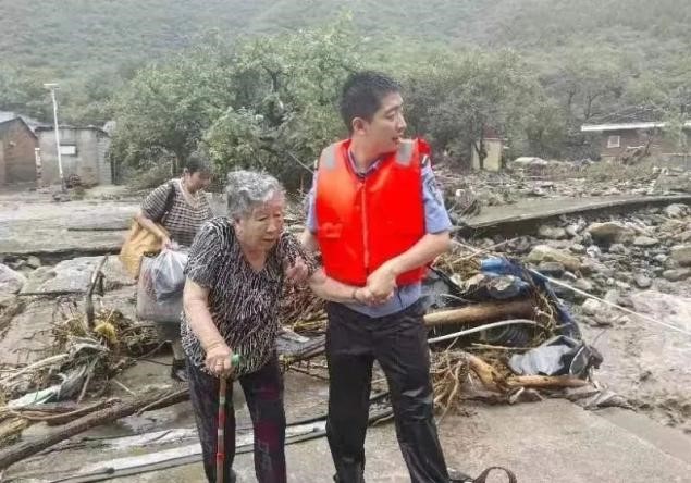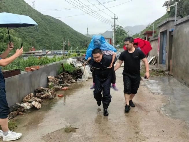昌平东水峪村大水封路,眼看房屋的墙壁可能有倾倒的危险,紧急情况下,昌平分局十三陵派出所民警卢立安背起屋内居住的老人,将其转移到安全地带。