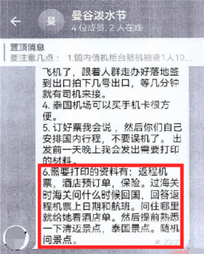 一行人中还有邓某的中学同学汤某,邓某以“好兄弟有钱一起赚”说服汤某加入。在群聊中,邓某通知大家准备出境打工事宜。他们按照“注意事项”,提前做功课了解当地景点,准备旅行计划,边检如问旅费,就说带了一万泰铢,同时打印好酒店预定、回程机票、保险等材料。
