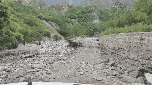 被洪水冲击过后的山路,两侧被掏空,路面积满碎石、杂物,尘土飞扬,难以看清前方路况。民警们冒着塌方的危险,克服山路凶险,4小时后终于将重病村民送至医院治疗。危难时刻,警车就是救护车。跋山涉水,无论路有多远多险,民警定会第一时间守住人民群众的生命线。