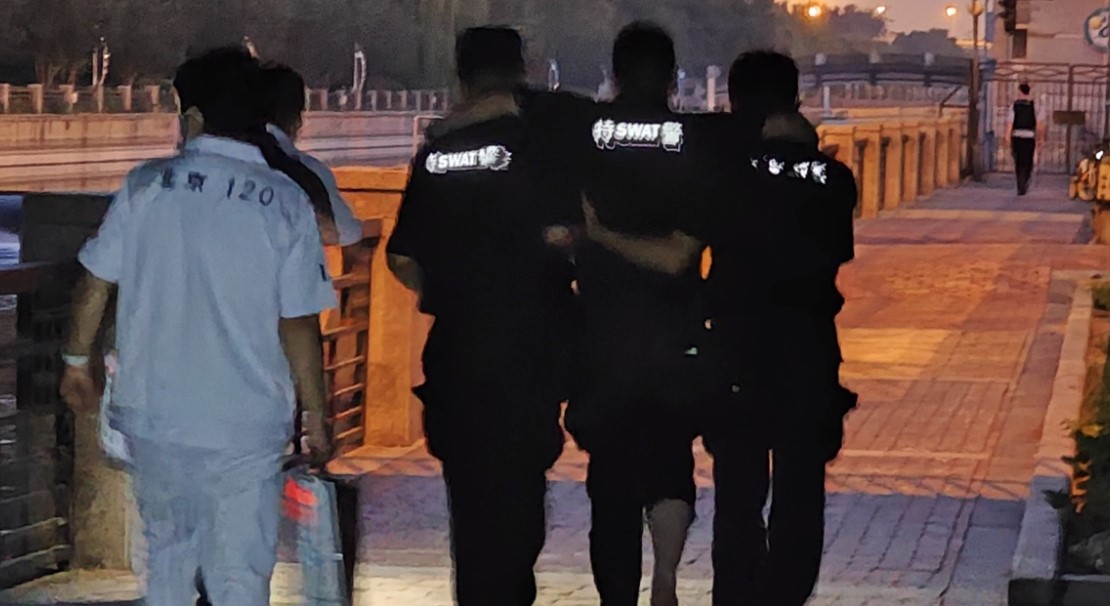 随后,民警与消防、急救人员一同将男子送往医院进行救治。在同事的帮助下,王安吉拖着伤脚离开了河岸,他们背上的“特警”二字,在远处灯光的映衬下格外闪耀。