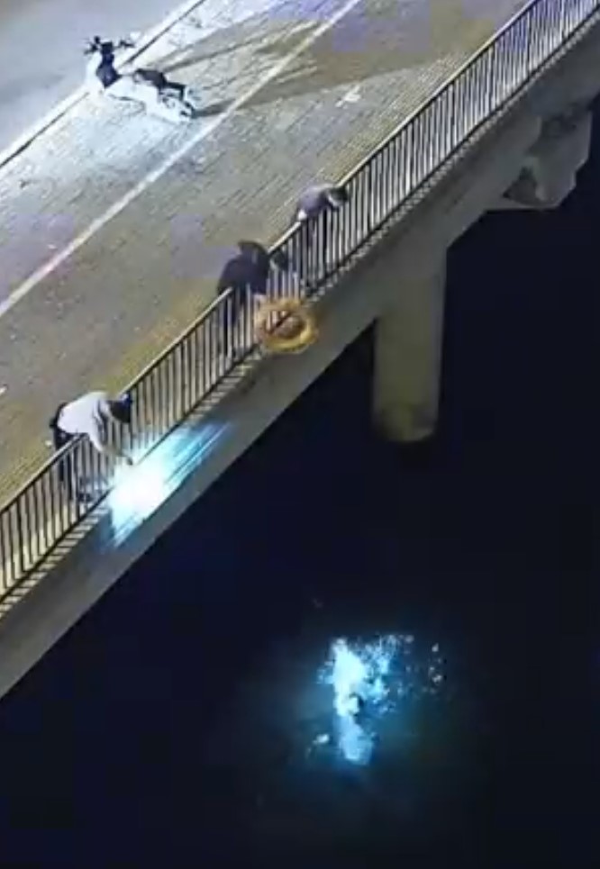现场,一名男子正站在桥护栏外,情绪十分激动。就在民警全力劝说时,男子突然松手从桥上滑落,坠入河里。