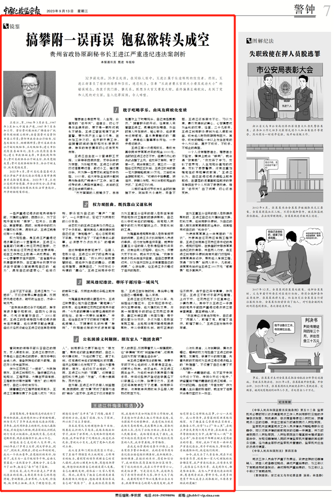 “在走向贪腐这条不归路时,原本有很多警示和教训,但因为心存侥幸,终究没有管好自己。”2002年底,王进江的老领导因为违纪违法接受组织调查,他也被要求配合调查。但这次经历没能让王进江记住其老领导的前车之鉴,反而在贪腐这条路上越走越远。