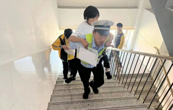 今年中考执勤期间,看到一位考生坐着轮椅来到学校门口,他立即找学校和监考老师沟通协调,将考生推进学校并背到四楼考场。