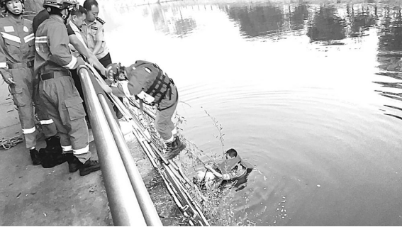 情况危急,救人要紧。辅警杨志波自告奋勇:“我精通水性,让我下去。”说着他脱掉警裤,跨过栏杆,一跃跳入水中。据杨志波事后介绍,当他跳到水中时,一下被水没过了头顶,感觉河水有三米多深。凭借较好的水性,杨志波迅速游动浮出水面,查看周围情况,没有发现落水者动静。时间一分一秒地过去,他判断落水者的大概位置后,深吸一口气,一个猛子扎进水中开始寻找,河水混浊,水里什么也看不清,还险些被水草缠住脚。后来,他看到前方水域水面上在冒气泡,便看准位置,立即游了过去。在水中,他用一只手抱住落水者的腰部用力将其托举出水面,奋力向岸边游去。河岸陡峭,距水面有两米多高。此时,消防员及时赶到现场,快速放下消防梯和救援绳,然后用绳固定住女孩的身体,大家合力将女孩救上岸。