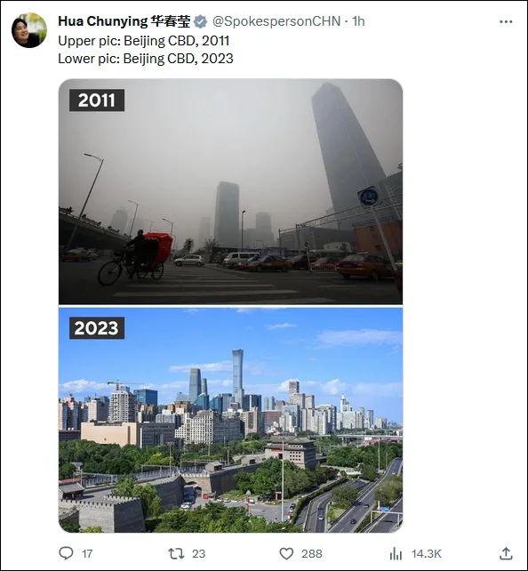 “上图:2011年的北京商务中心区(CBD)。下图:2023年的北京商务中心区(CBD)。”