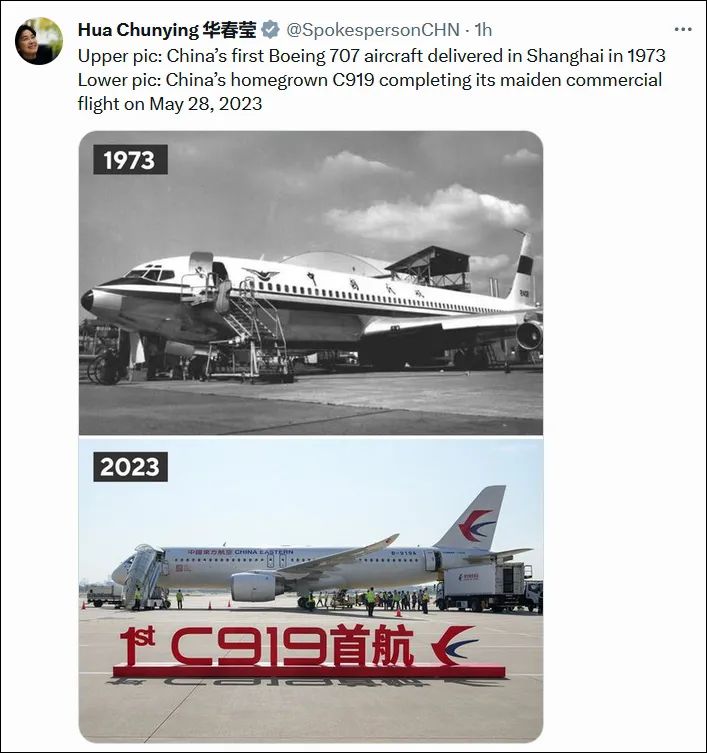“上图:1973年在上海交付的中国第一架波音707飞机。下图:中国国产的C919于2023年5月28日完成首次商业飞行。”