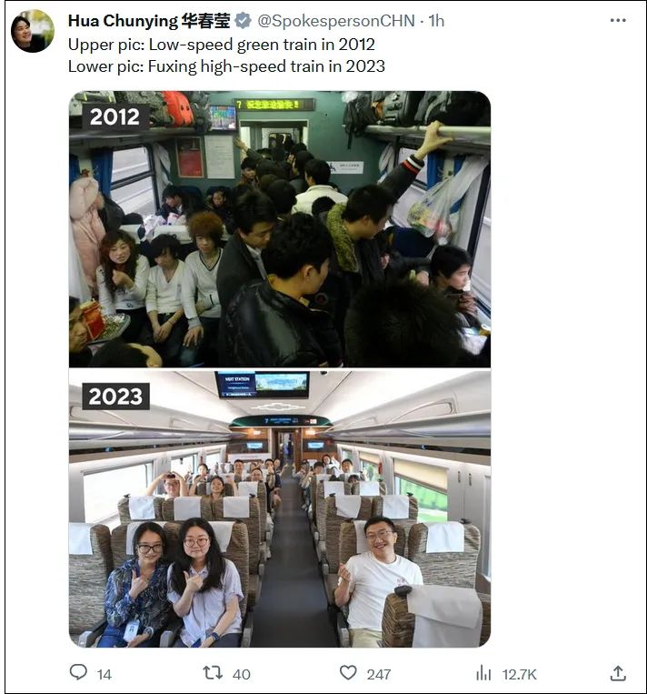 “上图:2012年的低速绿皮火车。下图:2023年的‘复兴号’高速列车。”