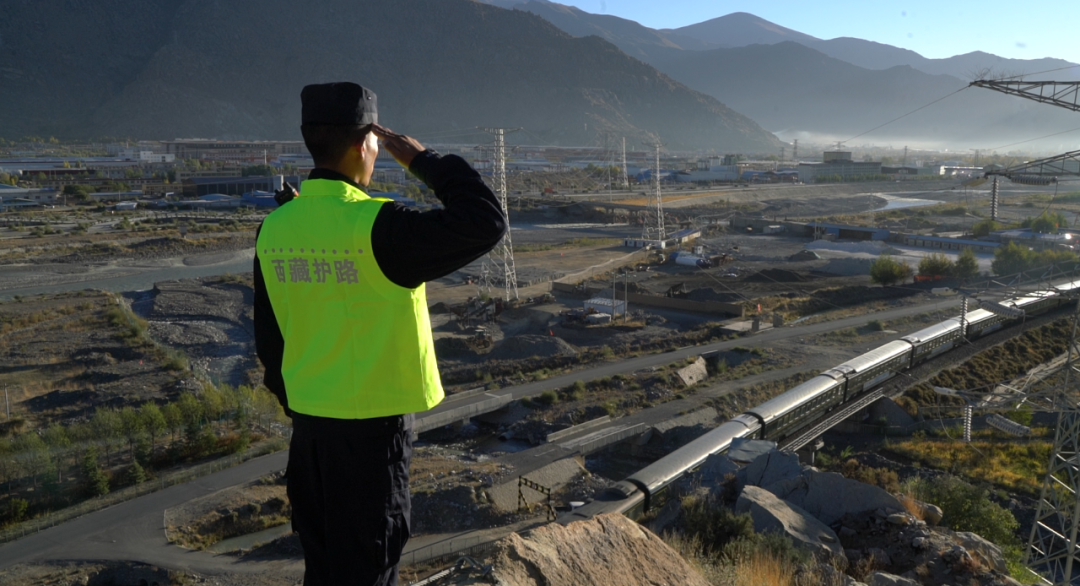 在清晨的第一缕阳光中一列火车徐徐驶来在火车的鸣笛声中达瓦次仁庄重地向火车敬礼