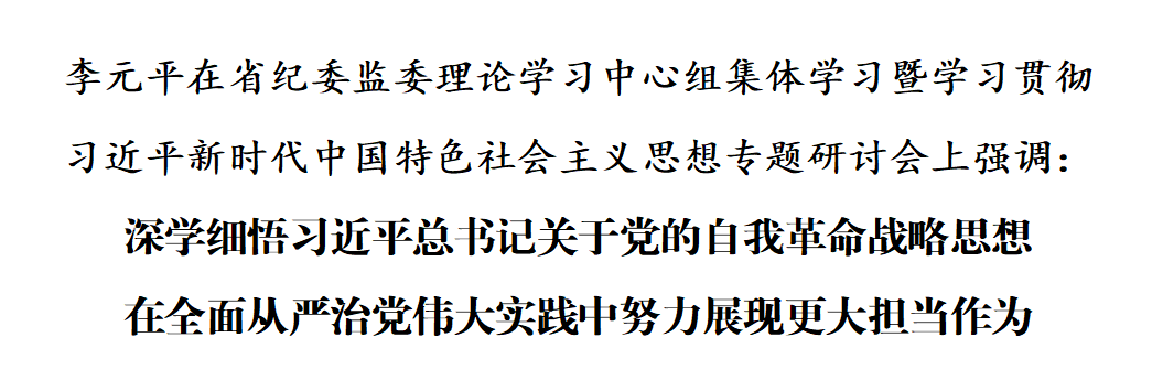 李元平强调,习近平总书记关于党的自我革命战略思想在习近平总书记关于党的建设的重要思想中具有重要地位,是习近平新时代中国特色社会主义思想的重要内容,为新征程深入推进党的自我革命提供了总遵循、总依据、总指引。我们要贯通学习、贯通理解,将其转化为走好全面从严治党新的长征路的强劲动力。一要深入领悟党的自我革命的内在逻辑,以更高的觉悟在党为党、在党忧党、在党兴党,强化推进党的自我革命的使命担当。二要深刻把握“两个永远在路上”的重要论断,永远吹冲锋号,以严的基调、严的措施推动全面形成严的氛围,守护好贵州政治生态的“山清水秀”。三要严格贯彻党的自我革命的实践要求,紧扣党章和宪法赋予纪检监察机关的职责定位攻坚破题,坚定不移推进全面从严治党向纵深发展。四要坚定发扬彻底的自我革命精神,以更严的要求打造忠诚干净担当、敢于善于斗争的纪检监察铁军,当好党和人民的忠诚卫士。纪检监察系统领导干部要带头树立严格自律的标杆形象,严于律己、严负其责、严管所辖。