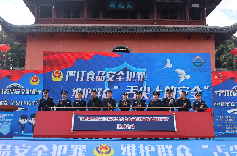 12月26日上午,福建省公安厅和龙岩市公安局在长汀联合开展食品安全宣传周“严打食品安全犯罪,维护群众‘舌尖上的安全’”公安主题宣传日活动。省公安厅治安总队总队长叶文玉、省食安办二级巡视员蒋爱民及市场监督管理、农业农村等相关部门领导同志出席活动。省市公安机关、相关行政主管部门、行业协会、学校师生、企业单位、群众代表共计400余人参加活动。