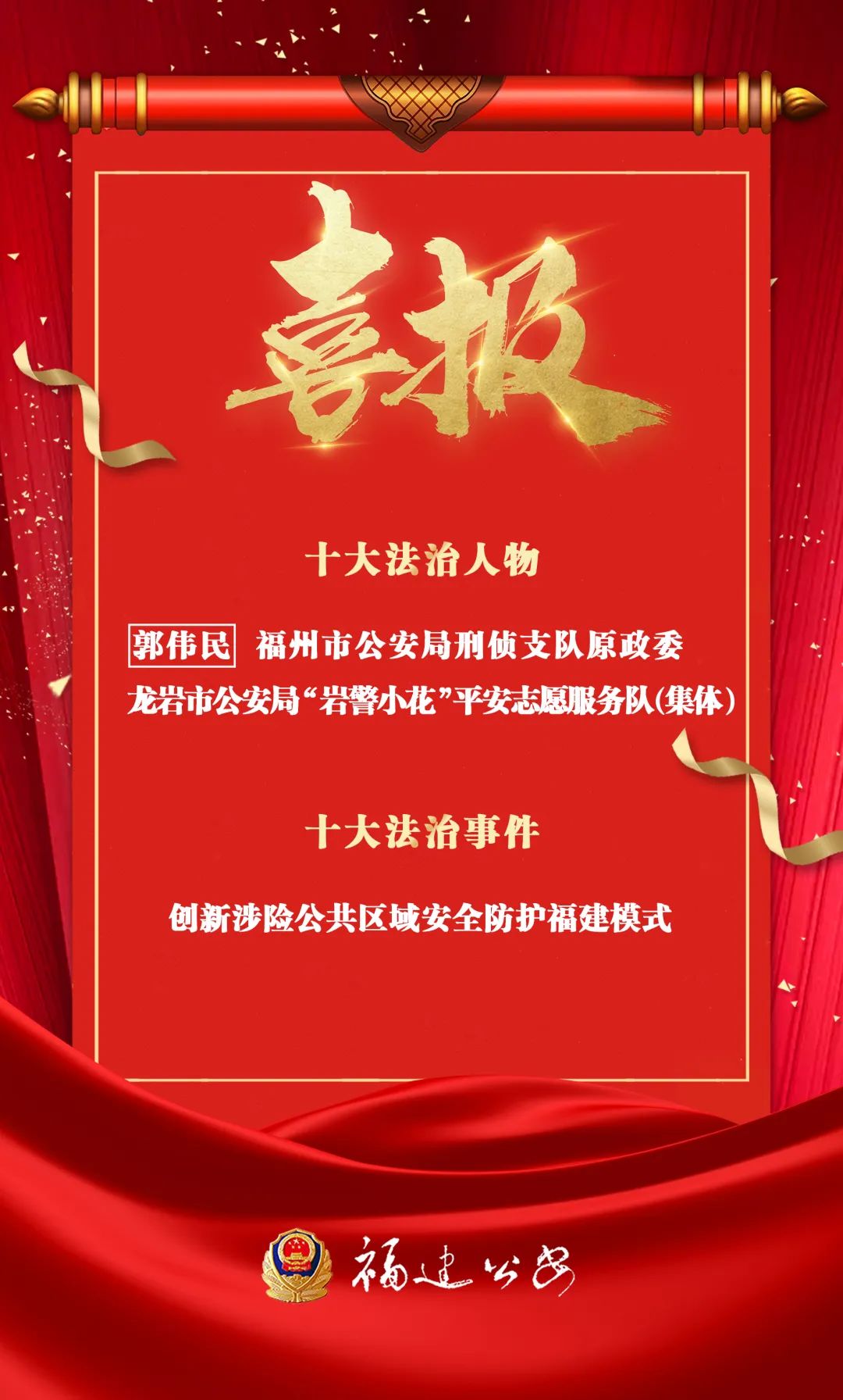 12月1日,2023年福建省“宪法宣传周”启动仪式暨十大法治人物和十大法治事件颁奖典礼举行。我省公安机关2个集体、个人获评“十大法治人物”,1个事件获评“十大法治事件”。