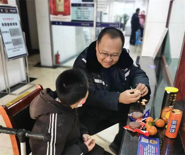 大年三十儿傍晚,朝阳分局亚运村派出所接热心群众报警:在路边捡到一个孩子,冻得瑟瑟发抖。随后民警立即将孩子接回派出所照看,因过度紧张,孩子看着全副武装的民警又惊又恐,嘴里一直喊着“奶奶”,缩在墙角,拒绝和民警说话。作为一名资深“惯孩子”家长,副所长高硕迅速找来一堆食物、水果和饮料,并“解除武装”,摘下帽子和口罩,在派出所前台接待区开启了宠娃模式。慢慢地,孩子也放下戒备,接过警察叔叔递过来的巧克力派,大口大口地吃了起来。