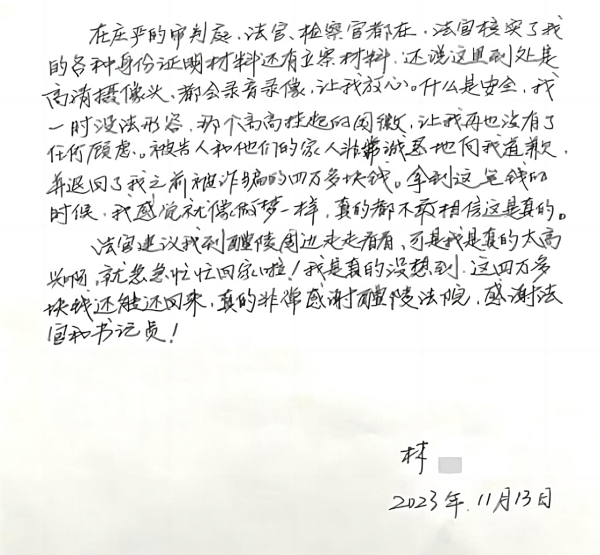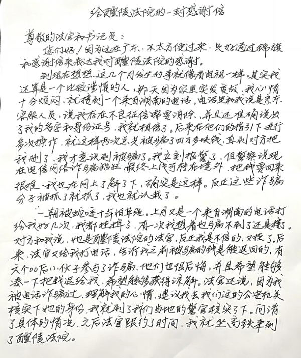 “在庄严的审判庭,法官核实了我的各种身份证明材料还有立案材料,还说这里到处是高清摄像头,都会录音录像,让我放心。什么是安全,我一时没法形容,那个高高挂起的国徽让我再也没有了任何顾虑。”林先生在收到退赔款后,从广东寄来了锦旗和这封恳切的感谢信。“被告人和他们的家人也非常诚恳地向我道歉,并退回了我之前被诈骗的四万多块钱。真的非常感谢醴陵法院,感谢法官和书记员。”