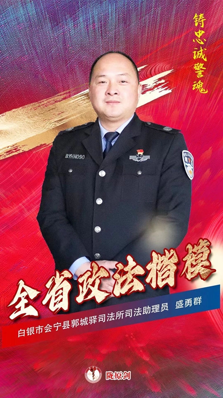在基层司法所工作十二载,他始终以勇于担当、恪尽职守、正直公平的工作作风和迎难而上、心系群众的工作态度受到镇辖区居民的高度好评。2021年7月,他被甘肃省司法厅评为“甘肃省枫桥式人民调解员”;2021年11月,被司法部评为“全国司法所模范个人”。2023年,他被表彰为全省“铸忠诚警魂”第二批政法楷模。他,就是甘肃白银市会宁县司法局郭城驿司法所的司法助理员盛勇群,也是老百姓口中的“湖南娃娃”“盛司法”。