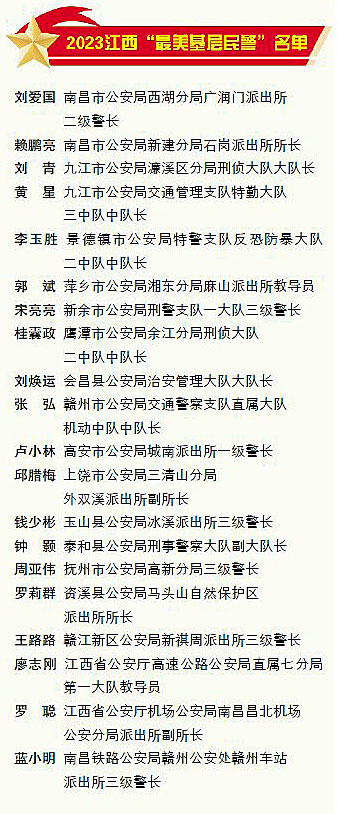 接受致敬(图/宗浩) 在平凡中成就伟大,用“最美”诠释忠诚。在第四个中国人民警察节即将来临之际,1月8日晚,省委宣传部、省公安厅在南昌联合举行“致敬平安守护者”——2023江西“最美基层民警”发布仪式。在如雷的掌声中,邱腊梅、周亚伟、刘爱国等20位2023江西“最美基层民警”登台领奖,接受致敬。 发布仪式以文艺节目致敬和名单发布交错的形式进行,其中,组唱《送你一朵小红花》表演者们将一朵朵小红花送给平安守护者,感人至深。 赞歌嘹亮,红花致敬。这20个名字成为新时代江西公安队伍闪亮的符号。 平安守护者送你花一朵 当日19时45分,发布仪式开始。新当选的2023江西“最美基层民警”身着警礼服、佩戴鲜艳的绶带坐在第一排,格外精神。在如雷的掌声中,邱腊梅、周亚伟、刘爱国等20位2023江西“最美基层民警”登台领奖,接受致敬。 为了向他们表达敬意,发布仪式现场还举行了文艺表演。“伟大的祖国赋予我使命,复兴的民族给予我力量,忠诚的道路浴血荣光,英雄的足迹越走越长……”开场奏唱的《中国人民警察警歌》催人奋进,将现场气氛推向高潮。 上饶市公安局推送的节目《只要平凡》,将公安民警扎根基层、无私奉献的故事娓娓道来;妙趣横生的合唱《黑猫警长》将现场观众带入时光隧道;赣州市公安局和南昌铁路公安局选送的联唱节目《渴望光荣》《送你一朵小红花》,唱出了江西公安民警的信心与豪迈,演唱者们将一朵朵小红花送给平安守护者,上演感人一幕。 据悉,江西“最美基层民警”宣传发布活动已连续举办5年,已选树出熊国海、邓金海、胡仁平、余旭华、徐东华等89名江西“最美基层民警”。 最亮的“光”最暖的守护 “今晚的他们,无疑是现场最亮的‘光’。”省公安厅宣传处相关负责人表示,这光亮的背后饱含了他们日复一日、年复一年的默默坚守和无私付出,“今天他们都格外精神,平时他们可能是你身边默默付出、鲜有人知道的普通民警。” 邱腊梅就是这样一位民警。她是上饶市公安局三清山分局外双溪派出所副所长,已经在大山上坚守了20年,被当地居民称为“三清山的媳妇”。 如果说邱腊梅是三清山上的一枝“铿锵腊梅”,那么资溪县公安局马头山自然保护区派出所所长罗莉群就是大山上的一株“深山含笑”。获奖后的罗莉群表示:“坚守初心,做好‘守山人’。把小事做好,让身边的人感受到温暖。” 大山需要保护,城市地标也需要呵护。南昌市公安局西湖分局广润门派出所二级警长刘爱国负责的万寿宫历史文化街区是新晋的网红打卡地。为了守护街区平安,刘爱国身体力行,组织沿街商户、物业人员等常态化开展巡逻保平安活动。 刘爱国、邱腊梅、罗莉群仅仅是众多平安守护者中的代表。记者了解到,20位2023江西“最美基层民警”中,不仅有来自基层派出所的,还有来自治安、刑侦、禁毒、特巡警以及铁路公安等警种的。过去的一年,他们在安保维稳第一线、服务人民最前沿、打击违法犯罪主战场尽职尽责,用实际行动绘就“最美”画卷。 以榜样为镜与榜样同行 萍乡市公安局湘东分局麻山派出所教导员郭斌在获得表彰后表示:“作为全国‘枫桥式公安派出所’的一员,此次获得的这份荣誉不仅属于我个人,更属于我们这个光荣的集体。” “我将不忘初心、牢记使命,努力作出新的贡献。”九江市公安局交管支队特勤大队三中队中队长黄星说。 表彰和致敬,不仅让新当选的“最美基层民警”心潮澎湃,也让全省公安民(辅)警备受鼓舞。在场的民警纷纷表示,要以榜样为镜,与榜样同行。 抚州市公安局高新分局青年民警左鹏辉为同事周亚伟获评“最美基层民警”感到骄傲:“我很荣幸能和周亚伟共事,工作中他总是冲在最前面。我将向他学习,踏踏实实工作,用心用情为百姓服务。” 青年民警张勇来自资溪县公安局马头山派出所。罗莉群获评“最美基层民警”让他深受鼓舞:“我和罗莉群分别在马头山自然保护区和马头山镇为民服务,我将向身边的榜样学习。” 来自三清山的陈先生与邱腊梅相识多年,他告诉记者:“邱警官一直尽职尽责,帮助村民们解决了许多实际问题。此次邱警官获评‘最美基层民警’,我打心里为她感到高兴,感到自豪。” |