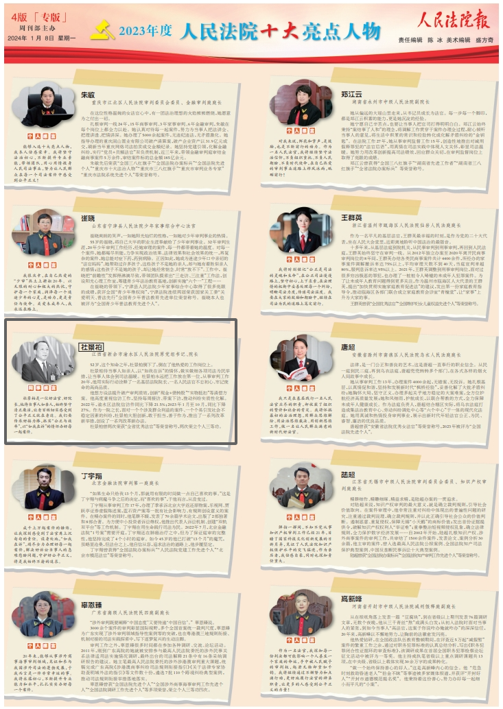 1月7日,人民法院报编辑部评选出2023年度人民法院十大亮点人物,江西省新余市渝水区人民法院原党组书记、院长杜景柏入选。 杜景柏 新余市渝水区人民法院 原党组书记、院长 52岁,这个知命之年,杜景柏倒下了,倒在了他热爱的工作岗位上。 杜景柏待当事人如亲人,以“如我在诉”的情怀,做实做细各项司法为民举措,让当事人体会到司法温暖。杜景柏永远把工作放在第一位,从事审判工作20年,他用实际行动诠释了一名基层法院院长、一名人民法官不忘初心、牢记使命的高尚品质。 他想方设法提升破产审判质效,创新“现金+债转股”“实物抵扣”等清偿方案。他高度重视信访工作,坚持每周接访、带案下访,推动纠纷实质性化解。2022年,渝水区法院信访件同比下降21.5%;2023年1月至10月,同比下降27%。作为一院之长,面对一个个涉及群众利益的案件、一个个易引发社会不稳定因素的纠纷,杜景柏大胆创新,敢于担当,善于作为,推出了一系列改革新举措,创设了一系列改革新办法。 杜景柏曾两次荣获“全省优秀法官”等荣誉称号,两次荣立个人三等功。 同事感言 杜景柏是一位好法官、好院长,他待当事人如亲人,始终坚守清正廉洁,让老百姓切实感受到了公平正义就在身边。我们要传承好接力棒,抓实“公正与效率”,以“如我在诉”的情怀办好每一起案件。 |