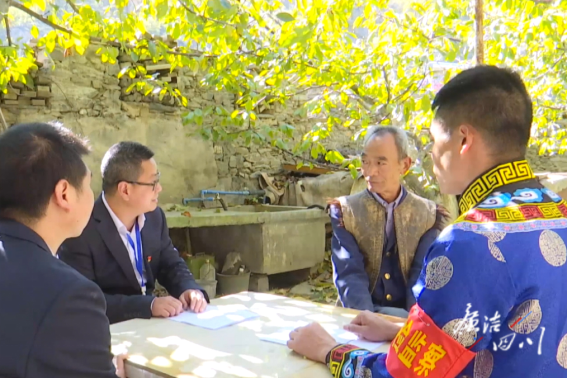 理县桃坪镇桃坪村监督委员会主任杨天敏(右一)和镇纪委工作人员一同走访群众。(杨玲 摄)