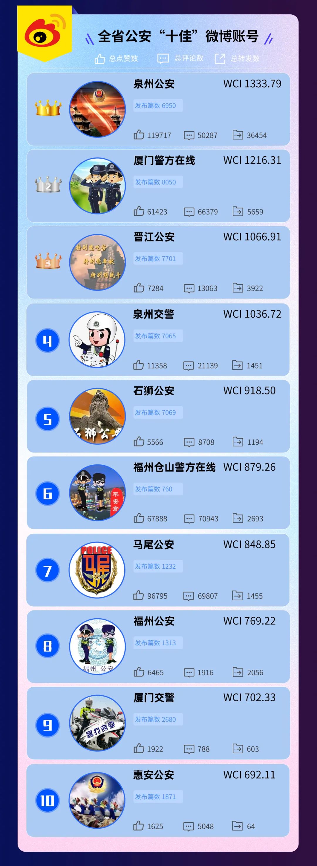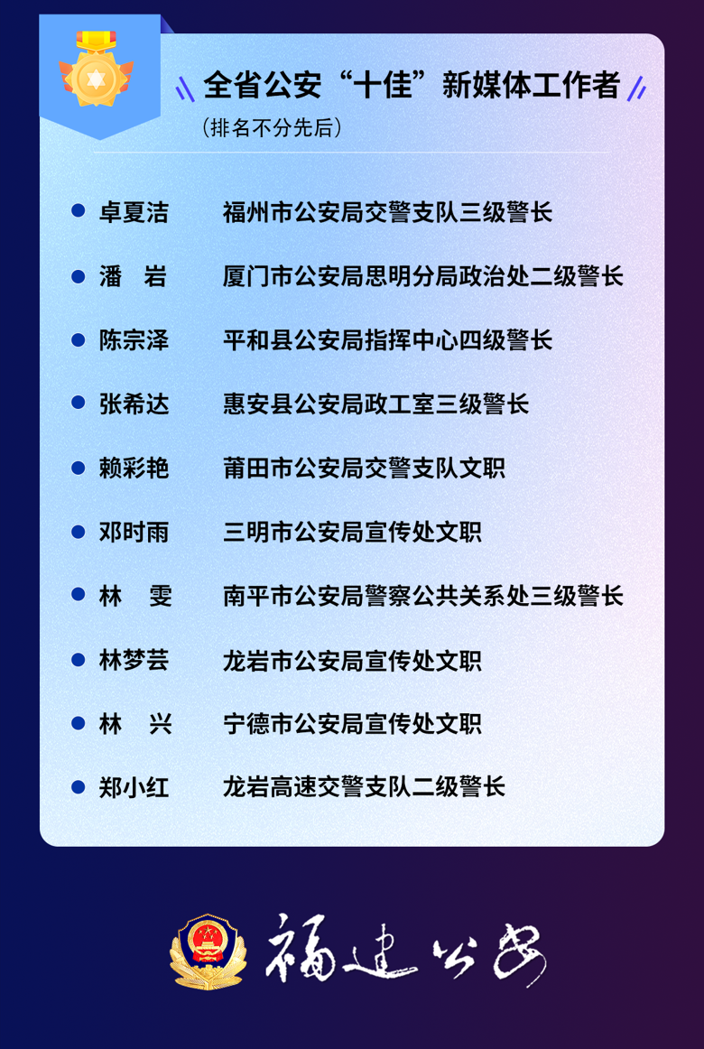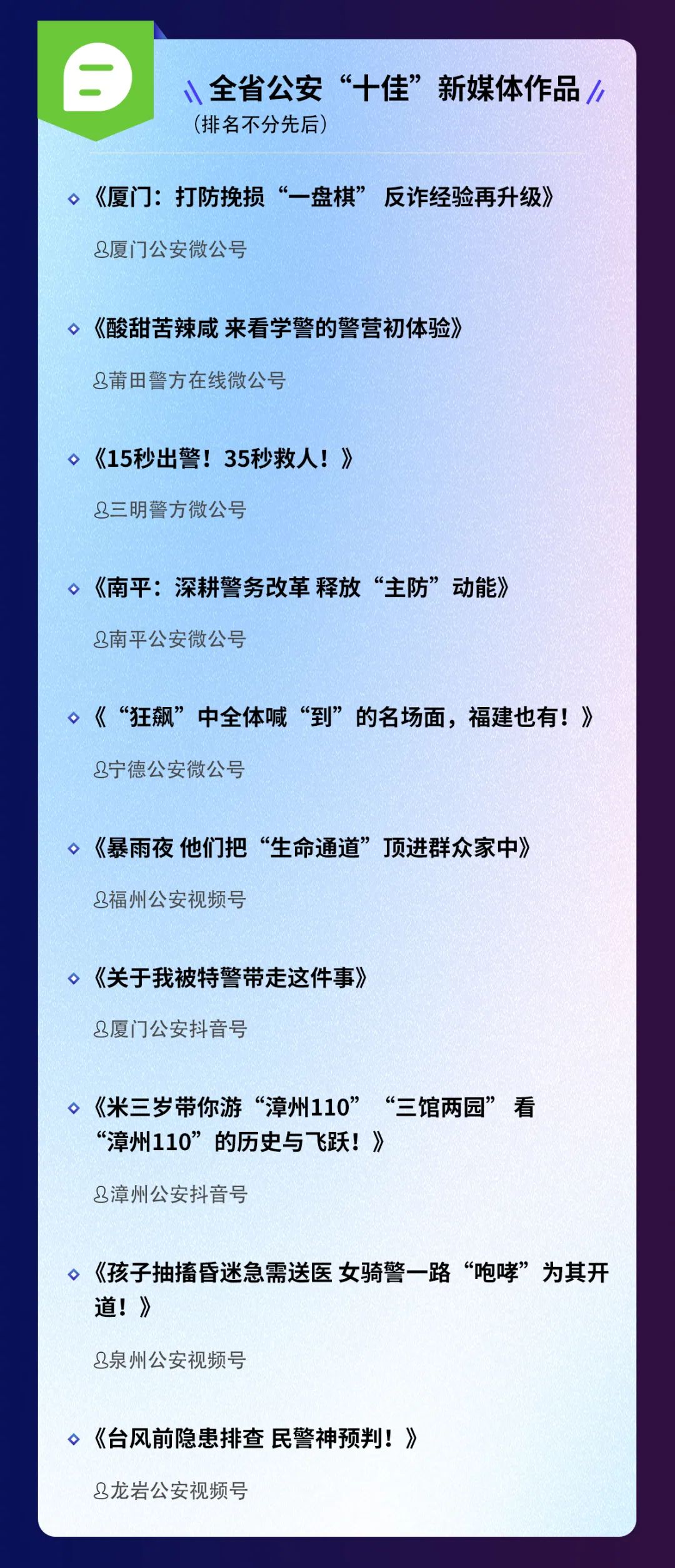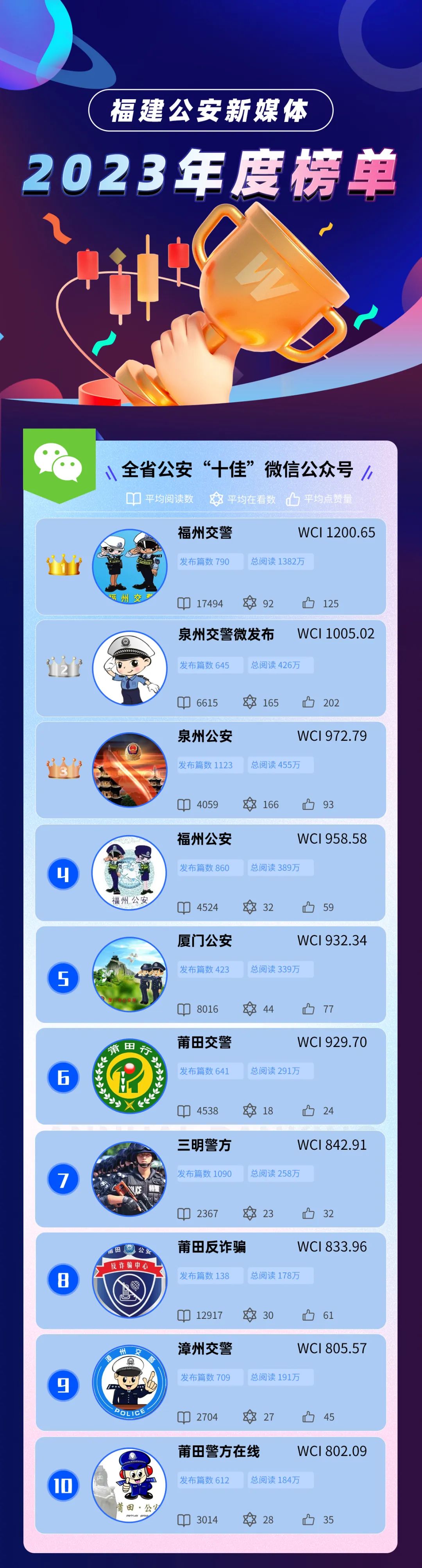 为深入学习贯彻习近平文化思想,进一步推动全省公安政务新媒体矩阵建设,有力促进公安工作高质量发展,日前,省公安厅政治部组织开展了2023年度全省公安“十佳”新媒体评选活动。评选结果现已新鲜出炉,这些账号、作品和工作者光荣上榜,祝贺!