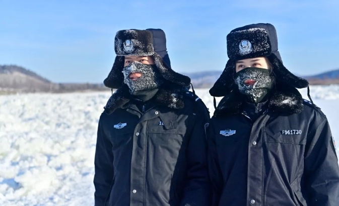 史先强、沈欣夫妇在冰封的中俄界江黑龙江上巡逻