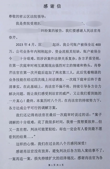 沈艳回忆:“那起案件从总体上而言仍属于被告败诉。没想到被告却送来感谢信和锦旗,他们认为肖法官认真、公允,所以服气。”