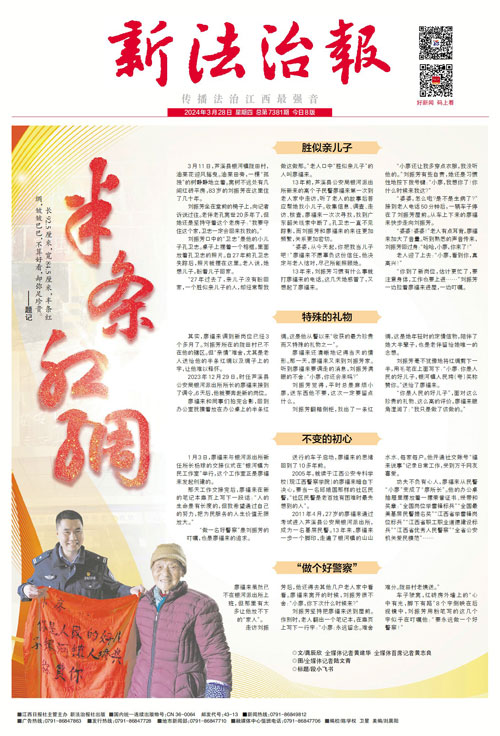 长92.5厘米,宽84.5厘米,半条红绸,皱皱巴巴,不算好看,却弥足珍贵。 ——题记 胜似亲儿子 3月11日,芦溪县银河镇陇田村,油菜花迎风摇曳。油菜田旁,一棵“孤独”的树静静地立着。离树不远处有几间红砖平房,83岁的刘振芳在这里住了几十年。 刘振芳坐在堂前的椅子上,向记者诉说过往。老伴老孔离世20多年了,但她还是坚持守着这个老房子:“我要守住这个家,卫忠一定会回来找我的。” 刘振芳口中的“卫忠”是他的小儿子孔卫忠。桌子上摆着一个相框,里面放着孔卫忠的照片。自27年前孔卫忠失踪后,照片就摆在这里。老人说,她想儿子,盼着儿子回家。 “27年过去了,亲儿子没有盼回家,一个胜似亲儿子的人,却经常帮我做这做那。”老人口中“胜似亲儿子”的人叫廖福来。 13年前,芦溪县公安局银河派出所新来的高个子民警廖福来第一次到老人家中走访,听了老人的故事后答应帮她找小儿子。收集信息、调查、走访、核查,廖福来一次次寻找,找到广东韶关线索中断了。孔卫忠一直不见踪影,而刘振芳和廖福来的来往更加频繁,关系更加密切。 “婆婆,从今天起,你把我当儿子吧!”廖福来不愿辜负这份信任,他决定与老人结对,尽己所能照顾她。 13年来,刘振芳习惯有什么事就打廖福来的电话。这几天她感冒了,又想起了廖福来。 “小廖还让我多穿点衣服,我没听他的。”刘振芳有些自责,她还是习惯性地按下拨号键:“小廖,我想你了!你什么时候来我这?” “婆婆,怎么啦?是不是生病了?”接到老人电话50分钟后,一辆车子停在了刘振芳屋前。从车上下来的廖福来快步走向刘振芳。 “婆婆!婆婆!”老人有点耳背,廖福来加大了音量。听到熟悉的声音传来,刘振芳回过身:“哈哈,小廖,你来了!” 老人迎了上去:“小廖,看到你,真高兴!” “你到了新岗位,估计更忙了,要注意身体,工作也要上进……”刘振芳一边拉着廖福来进屋,一边叮嘱。 特殊的礼物 其实,廖福来调到新岗位已经3个多月了。刘振芳所在的陇田村已不在他的辖区。但“亲情”难舍,尤其是老人送给他的半条红绸以及绸子上的字,让他难以释怀。 2023年12月29日,时任芦溪县公安局银河派出所所长的廖福来接到了调令。6天后,他就要奔赴新的岗位。 廖福来和同事们拍完合影,回到办公室抚摸着放在办公桌上的半条红绸。这是他从警以来“收获的最为珍贵而又特殊的礼物之一”。 廖福来还清晰地记得当天的情形。那一天,廖福来又来到刘振芳家。听到廖福来要调走的消息,刘振芳满眼的不舍:“小廖,你还会来吗?” 刘振芳觉得,平时总是麻烦小廖,送东西他不要,这次一定要留点什么。 刘振芳翻箱倒柜,找出了一条红绸,这是她年轻时的定情信物,陪伴了她大半辈子,也是老伴留给她唯一的念想。 刘振芳毫不犹豫地将红绸剪下一半,用毛笔在上面写下:“小廖:你是人民的好儿子,银河镇人民垮(夸)奖称赞你。”送给了廖福来。 “你是人民的好儿子”,面对这么珍贵的礼物、这么高的评价,廖福来眼角湿润了:“我只是做了该做的。” 不变的初心 1月3日,廖福来与银河派出所新任所长杨球的交接仪式在“银河镇为民工作室”举行,这个工作室正是廖福来发起创建的。 那天工作交接完后,廖福来在新的笔记本扉页上写下一段话:“人的生命是有长度的,但我希望通过自己的努力,把为民服务的人生价值无限放大。” “做一名好警察”是刘振芳的叮嘱,也是廖福来的追求。 送行的车子启动,廖福来的思绪回到了10多年前。 2005年,就读于江西公安专科学校(现江西警察学院)的廖福来暗自下决心,要当一名邱娥国那样的社区民警,“社区民警是老百姓有困难时最先想到的人”。 2011年4月,27岁的廖福来通过考试进入芦溪县公安局银河派出所,成为一名基层民警。13年来,廖福来一步一个脚印,走遍了银河镇的山山水水、每家每户。他开通社交账号“福来说事”记录日常工作,受到万千网友喜爱。 功夫不负有心人,廖福来从民警“小廖”变成了“廖所长”。他的办公桌抽屉里摆放着一摞荣誉证书、绶带和奖章:“全国岗位学雷锋标兵”“全国最美基层民警提名奖”“江西省学雷锋岗位标兵”“江西省职工职业道德建设标兵”“江西省优秀人民警察”“全省公安机关爱民模范”…… “做个好警察” 廖福来虽然已不在银河派出所上班,但那里有太多让他放不下的“家人”。 走访刘振芳后,他还得去其他几户老人家中看看。廖福来离开的时候,刘振芳很不舍:“小廖,你下次什么时候来?” 刘振芳坚持把廖福来送到屋前。作别时,老人翻出一个笔记本,在扉页上写下一行字:“小廖:永远留念。难舍难分。陇田村老姨送。” 车子驶离,红砖房外墙上的“心中有光,脚下有路”8个字倒映在后视镜中,刘振芳用粉笔写的这几个字似乎在叮嘱他:“要永远做一个好警察!” ◎文/龚辰欣 全媒体记者黄建华 全媒体首席记者黄志良 ◎图/全媒体记者陆文青 ◎标题/段小飞书 |