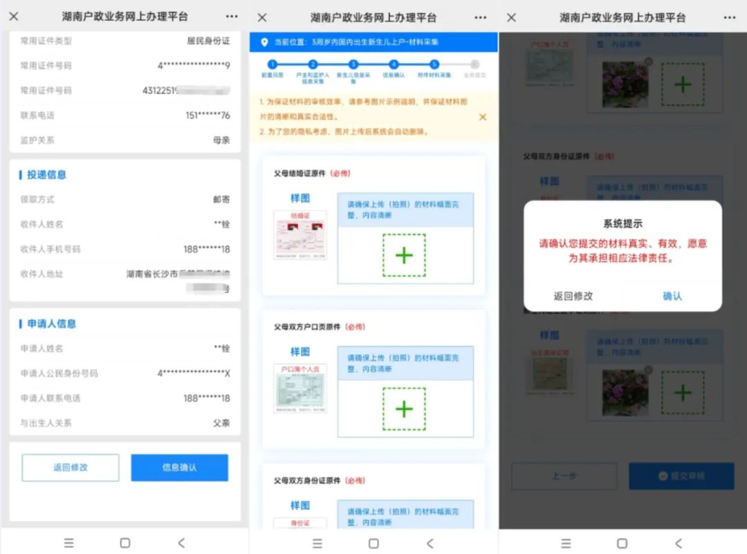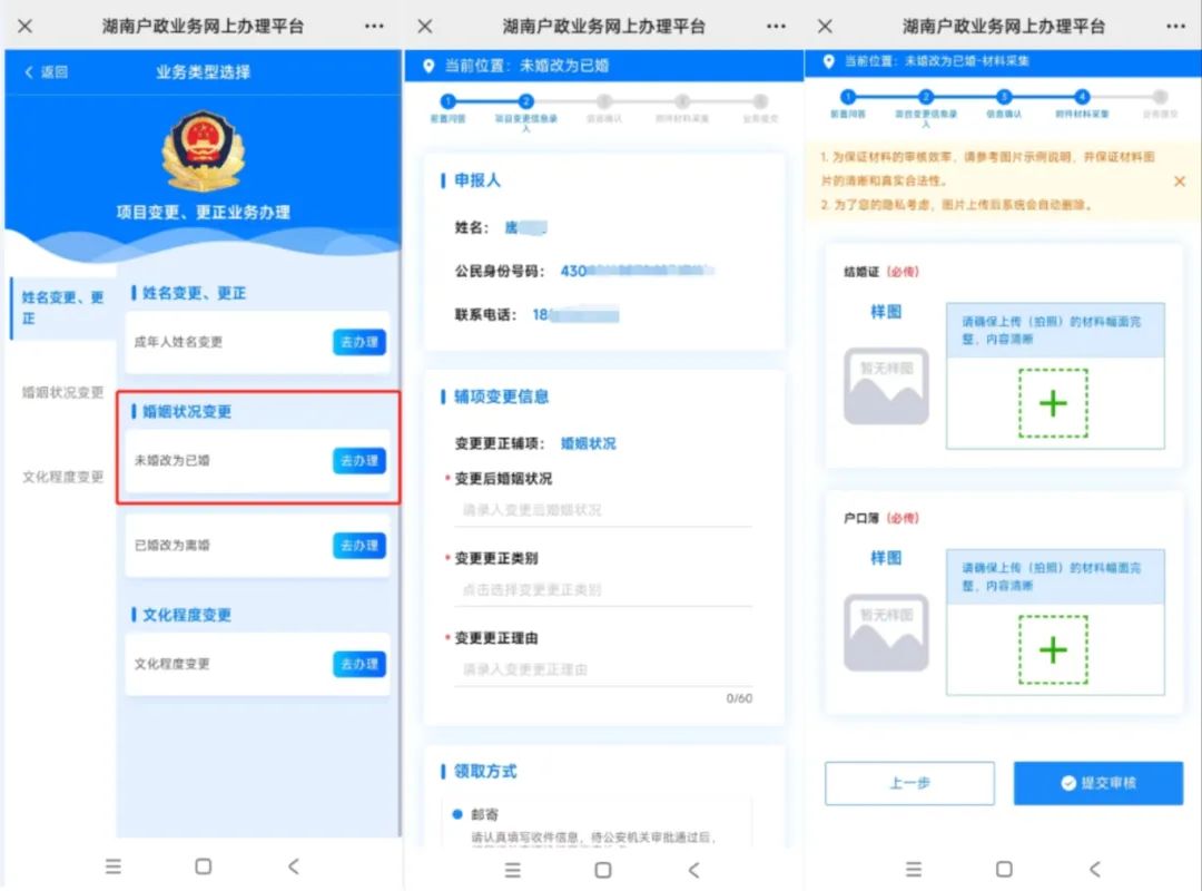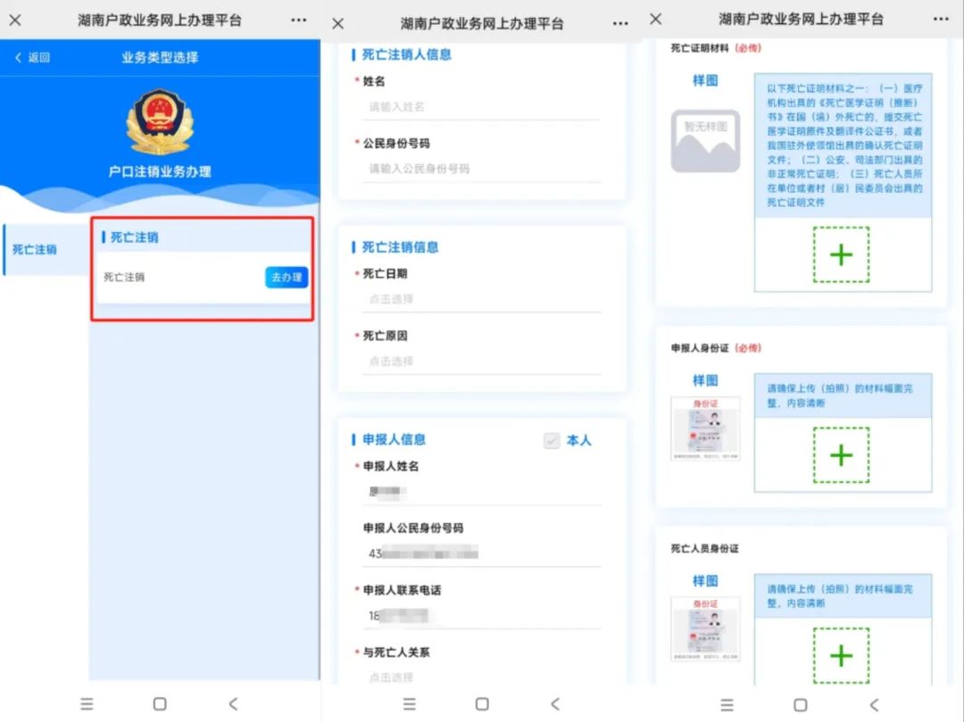 湖南省公安厅在前期推出人像社会化采集、身份证补领、暂住登记申报及居住证办理查询、证照办理进度查询、死亡注销业务等全流程网上办理服务的基础上,4月1日,升级了死亡注销业务受理模块,又推出了3周岁以内国内出生新生儿登记、成年人姓名变更、未婚变更为已婚、已婚变更为离婚、文化程度变更、户口簿补领、户籍证明、户口登记项目变更更正证明等八项全流程网上办理的户政业务。