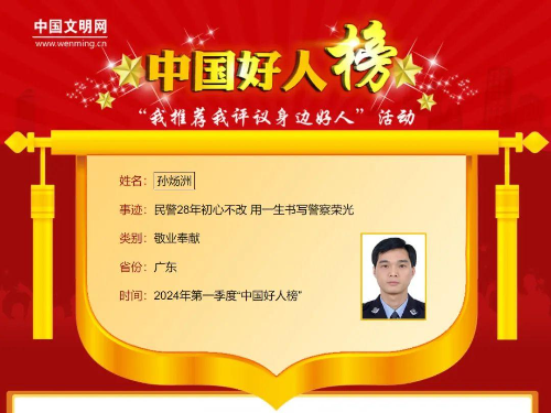 4月18日,中央精神文明办公室公布了2024年第一季度“中国好人榜”,揭阳市公安局已故民警孙炀洲被追授敬业奉献类“中国好人。
