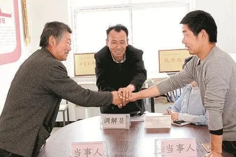 2023年4月21日,在桥镇村“樊九平调解工作室”,樊九平(中)调处一起村民矛盾纠纷,经调解,当事人双方握手言和。