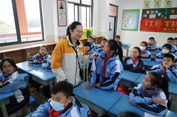 近年来,连江县民政局以加强和创新基层社会治理为契机,着力强化社会工作人才培养、资源统筹和岗位开发,有力加快了全县社会工作人才和机构的发展步伐。截至目前,全县社工人才总量已达1385人,每万人服务占比已达20人,位居全市前列。图为社工余婷婷近期深入敖江中心小学,开展青少年宪法宣传活动。 □曾铖 陈成志 摄