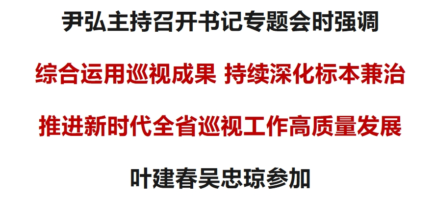 6月20日,省委书记尹弘主持召开书记专题会,听取十五届省委第五轮巡视情况汇报。尹弘强调,要深入学习贯彻习近平总书记关于党的自我革命的重要思想,全面落实新修订的《中国共产党巡视工作条例》,结合开展党纪学习教育,综合运用巡视成果,持续深化标本兼治,推进新时代全省巡视工作高质量发展,为谱写中国式现代化江西篇章提供坚强保障。