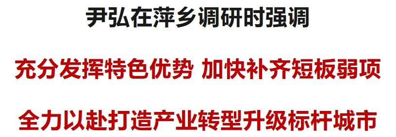 7月4日,省委书记尹弘深入萍乡调研,并召开座谈会听取萍乡市工作汇报。他强调,要深入贯彻习近平总书记考察江西重要讲话精神,聚焦“走在前、勇争先、善作为”的目标要求,充分发挥特色优势,加快补齐短板弱项,全力以赴打造产业转型升级标杆城市,坚定不移推动经济社会高质量发展。
