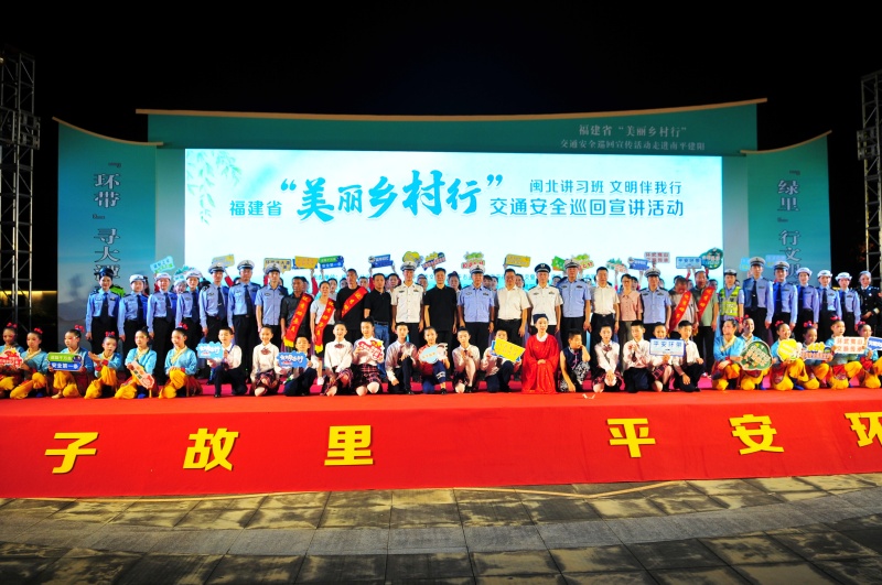 为持续营造社会关注,积极动员全民参与交通安全宣教的浓厚氛围,进一步提升广大农村地区群众的交通安全意识,6月30日晚,由福建省公安厅交警总队、南平市委文明办、南平市道安办、南平市公安局交警支队、建阳区委宣传部联合主办的福建省“美丽乡村行”交通安全巡回宣讲活动在南平市建阳区考亭村观书园广场隆重举行。此次活动由交警支队建阳大队以及建阳区直多部门联合承办,来自周边村居群众、各行业代表、交通安全劝导员等500余人参加了此次活动。南平市委文明办主任黄益水、市道安办主任颜德贵、市公安局副局长吴世平、市局交警支队长汪火昌等领导出席活动。