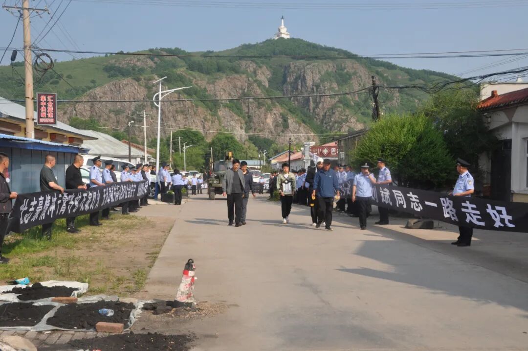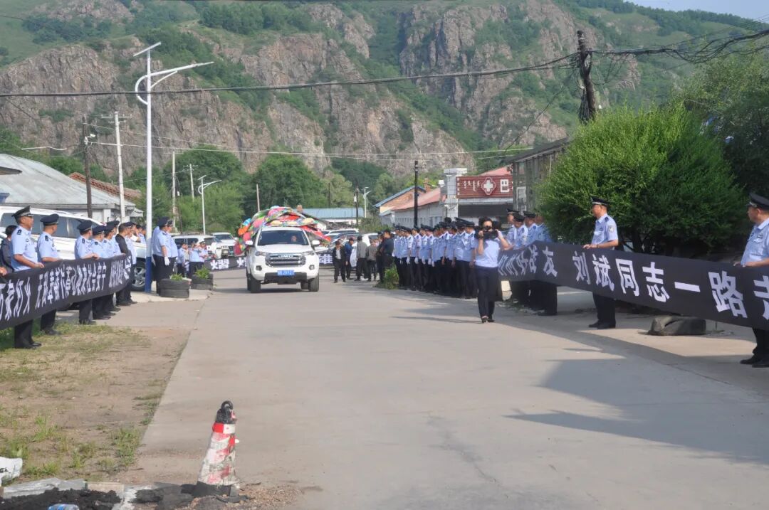 刘斌同志的离去,让这片广袤的森林也为之悲泣。灵车经过的路上,前来送别的战友、亲人、群众胸佩白花,整齐列队,难掩悲痛送英雄最后一程。