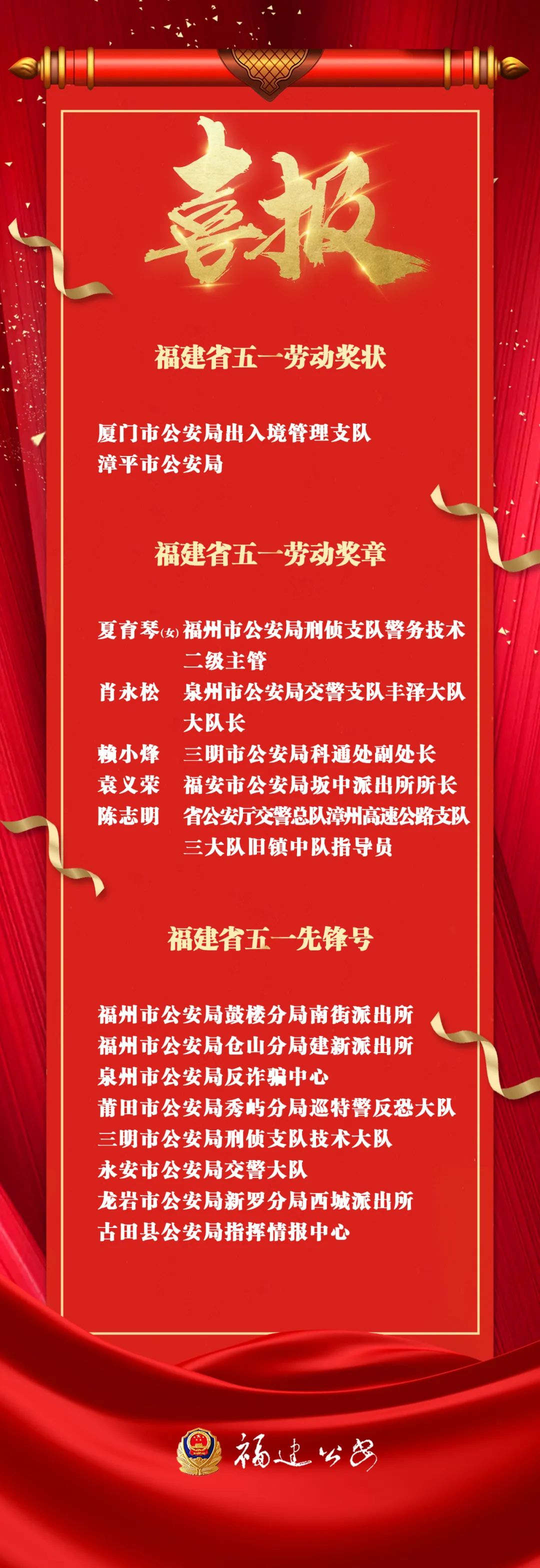 为表彰先进、树立典型,大力弘扬劳模精神、劳动精神、工匠精神,激励广大职工积极投身新时代新福建中国式现代化建设,在全社会营造劳动光荣的社会风尚和精益求精的敬业风气,近日,福建省总工会印发《关于表彰2024年福建省五一劳动奖和福建省工人(五一)先锋号的决定》,表彰一批先进集体与个人。其中,福建公安5名个人、10个集体光荣上榜。