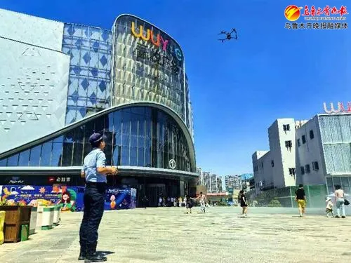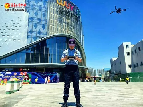 7月7日,在米东吾悦广场上空,乌鲁木齐市公安局特警三支队民警操作无人机进行反诈宣传。