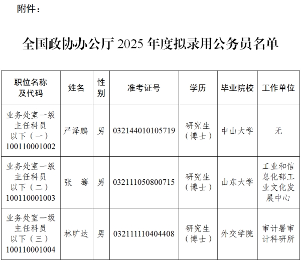 根据2025年度中央机关及其直属机构考试录用公务员工作有关要求,经笔试、专业能力测试、面试、体检和考察等程序,确定严泽鹏等3人为全国政协办公厅2025年度拟录用公务员(名单附后),现按规定进行公示,公示期为5个工作日。公示期间,如对人选有不同意见,请向全国政协办公厅人事局反映。