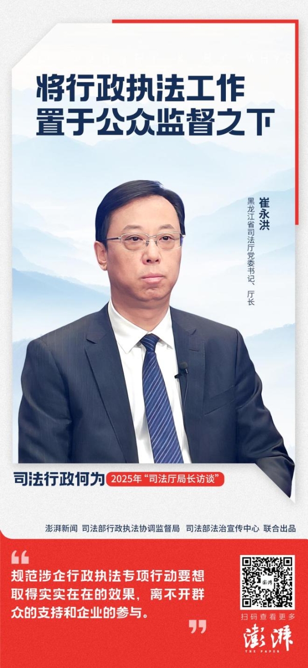 为此,澎湃新闻联合司法部行政执法协调监督局、司法部法治宣传中心推出2025年“司法厅局长访谈”,分享有关行政执法监督、涉企行政执法的地方经验。本期访谈嘉宾为黑龙江省司法厅党委书记、厅长崔永洪。